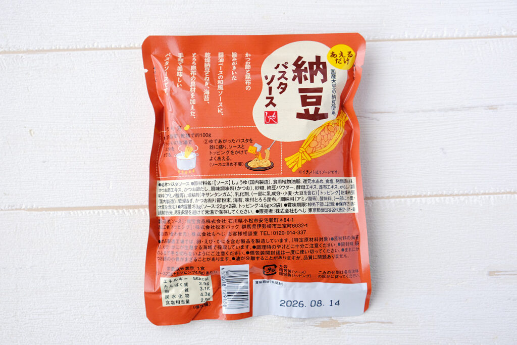 このパスタソースは2食入りで343円と、価格自体は標準的。しかし、納豆パスタってパックの納豆で結構手軽に作れちゃうので、もう少し個性が欲しかったなぁというのが食後の率直な感想ですかね。