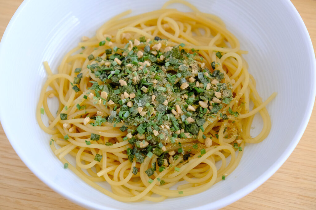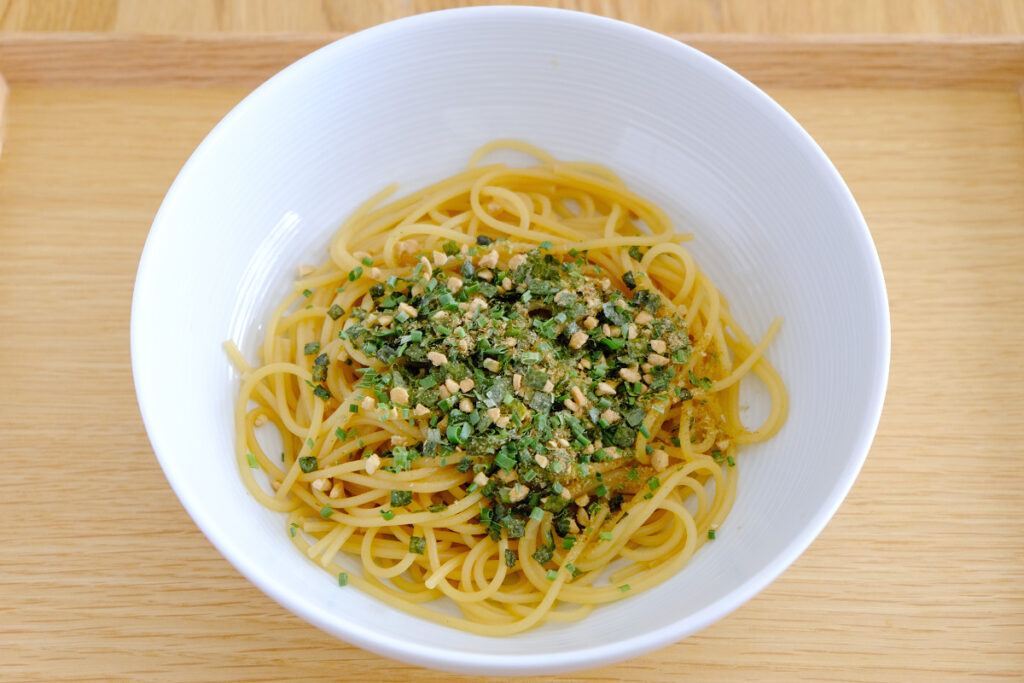 ソースを茹でたパスタに和えて、トッピングをまぶしたら調理完了。レンジで麺を茹でれば鍋いらずで調理可能です。